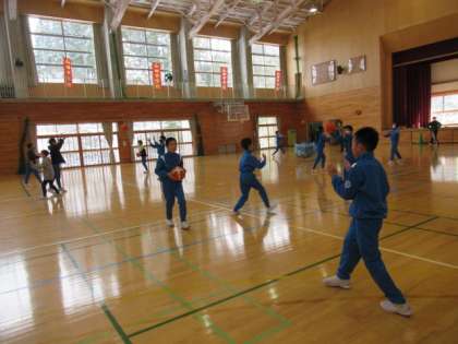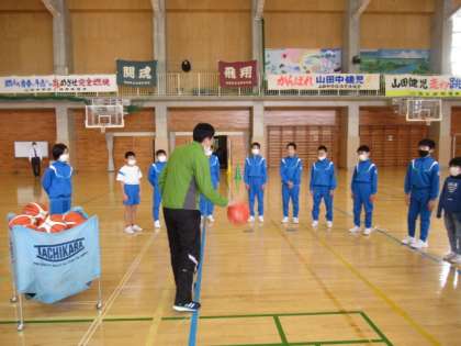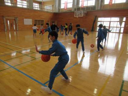 写真は、1月に入ってバスケの練習をし始めた上学年の子供たちです。ドリブルやパスなどの基本の動きを確かめました。