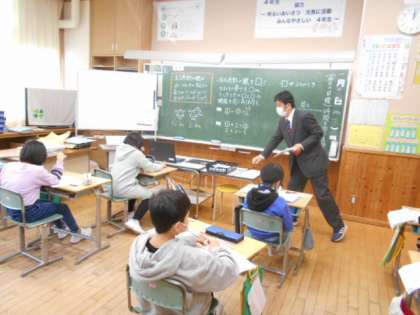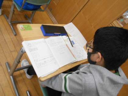 4年生は算数科で、2つの伴って変わる数量について学習をしています。2つの数量がどのように変化をしているのかに着眼し、規則性を見付けて立式しました。