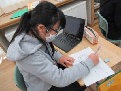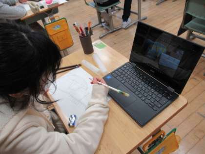 ランドセルや水彩セット等、それぞれの小学校生活の思いが込められた物を選んで下絵にしています。Chromebookで写真にしながら、構図を確かめ描いていきました。
