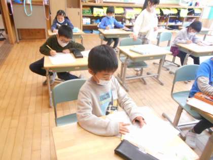 1年生は、今週行う「計算にチャレンジテスト」の練習問題に取り組みました。くり上がりやくり下がりのある計算問題に気を付けて計算をしていました。