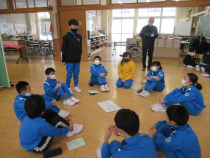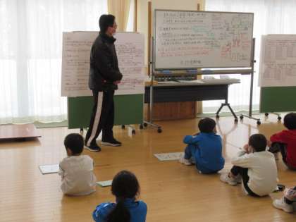 21日(金)のスキー学習に向けて、動きや目当てを確認しました。全体の話の後には、班別で自分の目当てを伝え合いました。