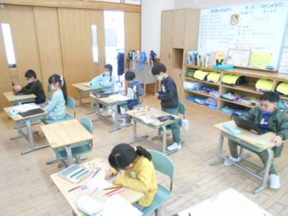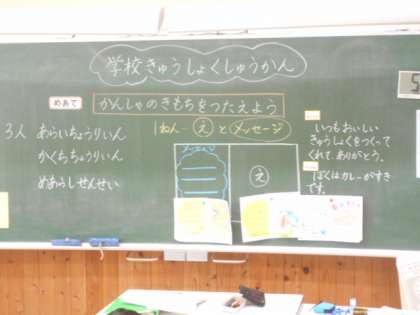 1年生は、いつもおいしい給食を準備してくださっている栄養教諭や調理員の方々に、感謝の気持ちを込めて、メッセージカード作りに取り組みました。