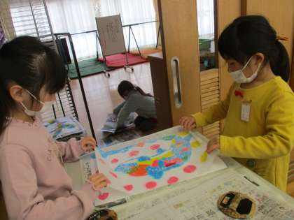 版に貼ったシールの色が、水に濡らしたすりとり紙にうつります。