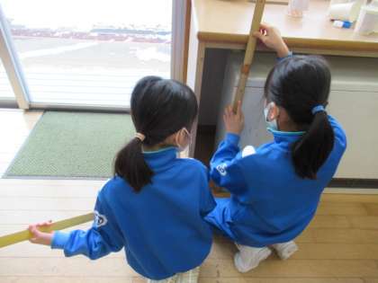 1メートルの竹ものさしを使って、教室にあるいろいろなものの長さをはかりました。