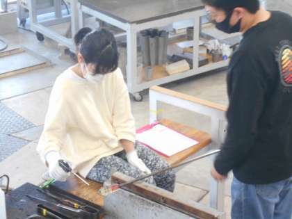 6年生はガラス工房に出かけ、ガラス造形による卒業記念作品づくりに取り組みました。自分のお好みの形や色、デザインを設計した後、工房の指導員と一緒に制作しました。