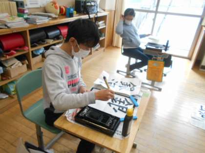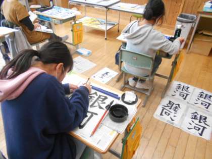 6年生は書写の時間に毛筆で「銀河」という言葉を書きました。へんとつくりのバランスに気を付けながら書きました。