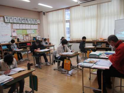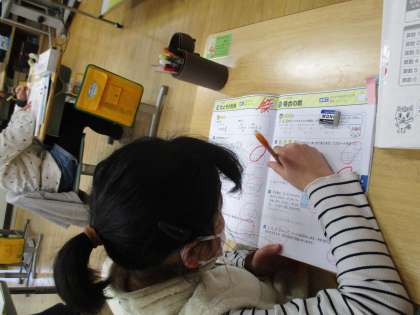 一年間の総復習をしています。ドリルが終わった子供は、和算(油わけ算)に挑戦しました。