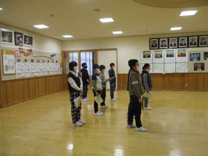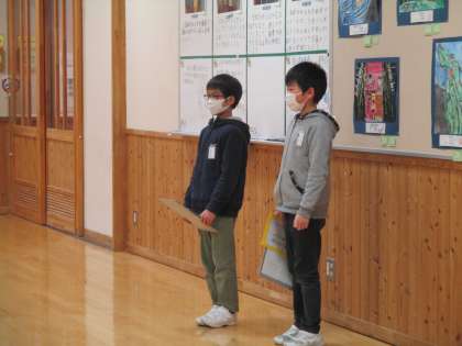 2月28日(月)に「卒業を祝う会」「児童会引継式」を予定しています。2つの会は、5年生が中心となって進行します。今日は、当日に向けて、学年で練習をしました。