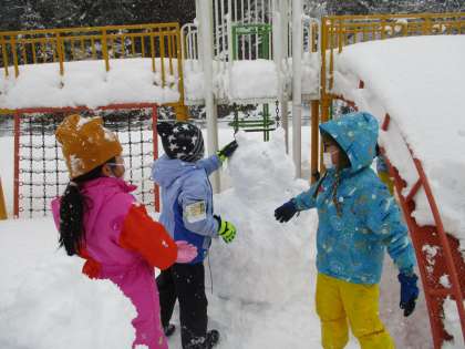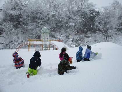芝生広場にたくさんの雪が積もっています。今日は、生活科の学習で、冬の自然を楽しみました。雪合戦をしたり、雪だるまやすべり台を作ったりするなど、思い思いに活動しました。