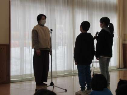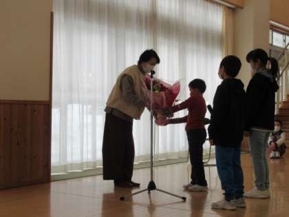 一年間お世話になった読み聞かせボランティアの方に、感謝の気持ちを伝えました。児童の代表が、心に残る本について話した後、お礼の花束を渡しました。心に残る本との出逢いを大切にしていきたいものです。