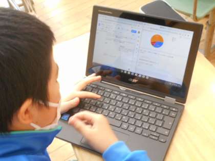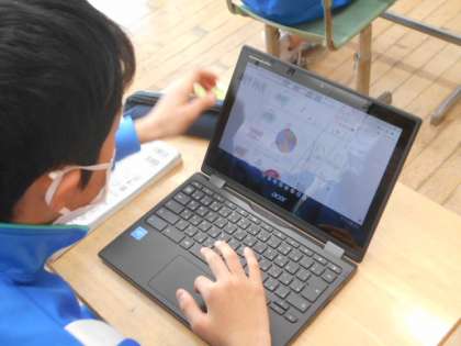 5年生は国語科で、「調べたことをまとめて提言する」という課題に取り組んでいます。子供たちは自分なりに調べたいことについてアンケートを作成し、友達に答えてもらった結果をコンピュータでまとめていました。