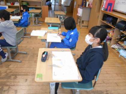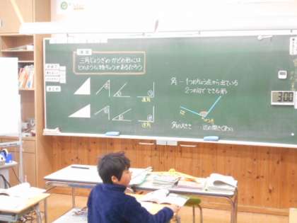 3年生は算数科で、角の大きさについて学習しました。一つの頂点からのびる2本の直線の広がり方に着目しながら、大きな角や小さな角について見方や考え方を深めました。