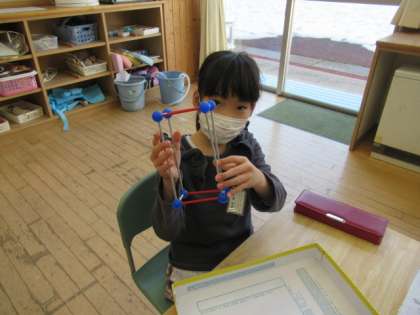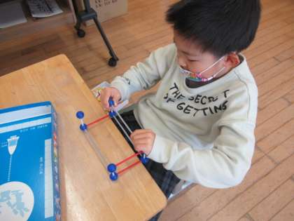 算数では、組み立て体験を通して、辺や頂点の数を確かめました。自然と頂点にどの長さのひごが集まってくるが考えることができます。