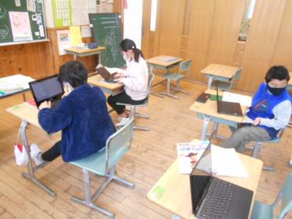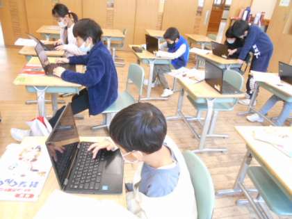 3年生は国語科で、パソコンでローマ字の入力を行いました。促音や濁音のある文字は難しいので、お手本と見比べつつ作業を進めました。