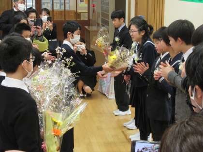 5年生が、祝い品の啓翁桜と花束、おめでとうの言葉を6年生教室に届けました。緊張がほぐれ、笑みがこぼれています。