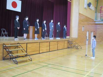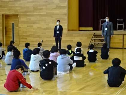 はじめに、新しく着任された先生の着任式を行いました。6年代表児童が歓迎のあいさつをしました。