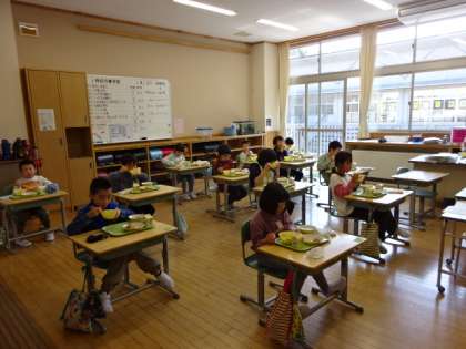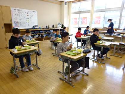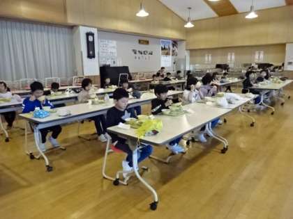 ランチルームでは、2年生と5年生が、教室では、3・4年生と6年生が給食を食べました。