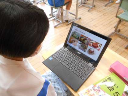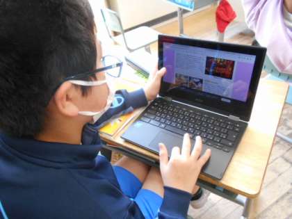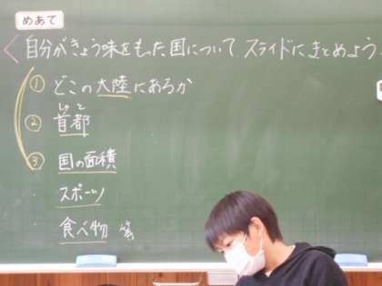 5年生は、社会科で「主だった外国の場所や国旗の様子」について学習しています。今日は、自分の興味のある国を選んで、調べたことをコンピュータのスライドにまとめる活動をしました。