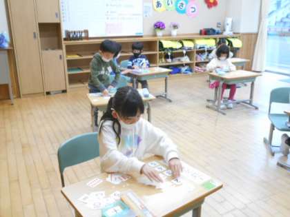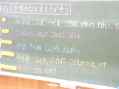 1年生は、カードを使いながら数字と具体物を照らし合わせて学習しました。具体物がいくつあるかを数字で表すよさを学びました。