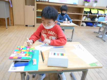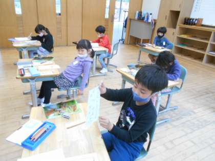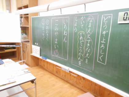 1年生は国語科で、自己紹介カードに自分の名前を書き込みました。黒板にあるお手本を見ながら、丁寧に文字を書いている様子が見られました。
