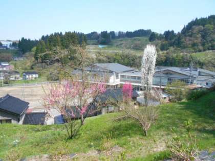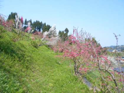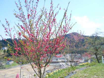 学校前の斜面に植えられているハナモモの花がとてもきれいに咲いています。ピンクや白色が、新緑のみどりと相まって美しいです。