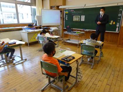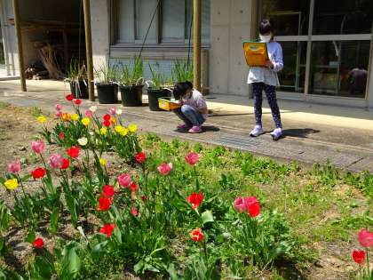 教室で話を聞いてから、外に出て学校の周りの生き物を探しました。調べる対象を決めたら、じっくり観察していました。
