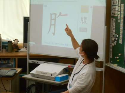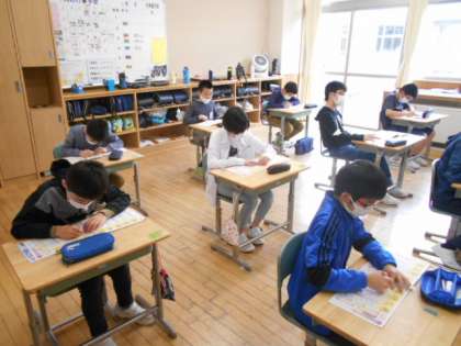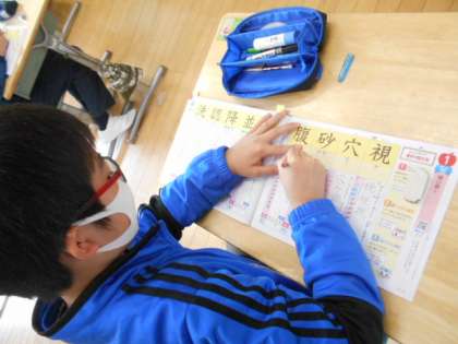 6年生は国語科で、ドリルを使いながら新出漢字を学習しました。書き順をみんなで指で書いてから、ドリルに記入しました。