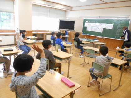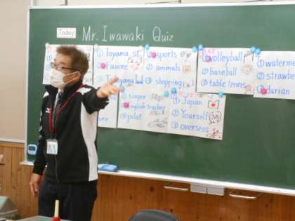 5年生は、専科教員の岩脇先生と外国語科の学習に取り組みました。グループ対抗で英語によるクイズに答えてポイントを競っていました。