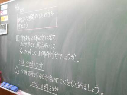3年生は算数科で、時刻と時間の学習に取り組みました。時計の針の進み方を考えながら、時間の長さを捉えようとしていました。