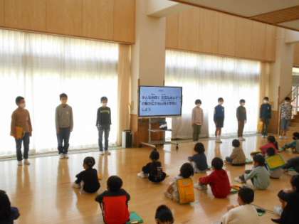 各委員会活動のメンバーと、それぞれの目当てを発表しました。「こんな学校生活ができたらよいな」という思いや願いを大切にして活動を進めてほしいと思います。