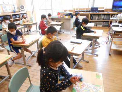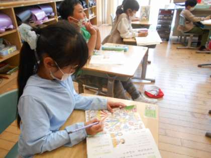 2年生は国語科で、お話をよく聞いて、挿絵に描かれているものを見付ける学習に取り組みました。正確にお話の内容を聞き取るように努めていました。