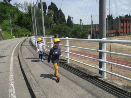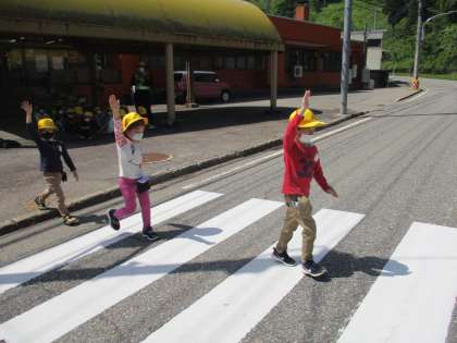 交通安全教室では、学校への登下校するときの歩行訓練を行いました。交通指導員のかたからのお話を聞き、実際に歩きました。しっかりと手を挙げて横断歩道を歩くことができました。