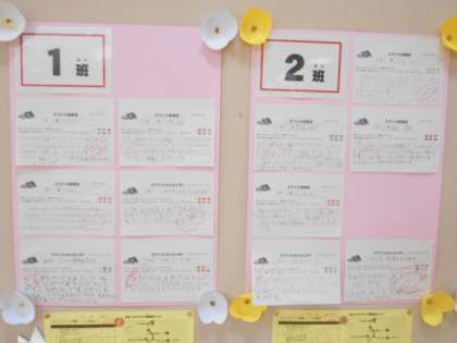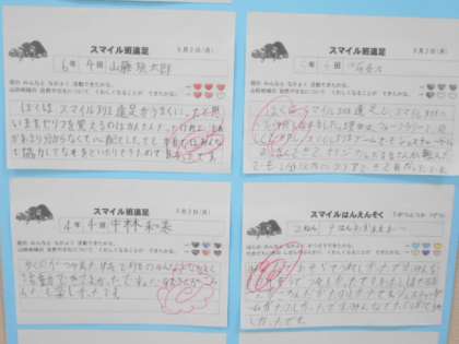 2階多目的ルームの掲示板に先日行った「スマイル班遠足」の振り返りカードを掲示しました。全校児童の取組に寄せる思いが分かります。