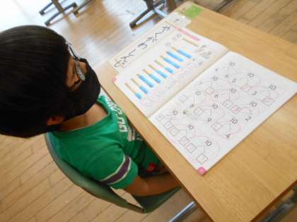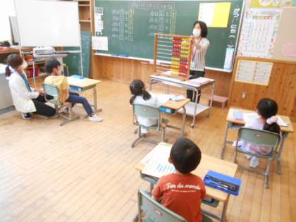 1年生は算数科で、「10はいくつといくつ」に分けることができるかについて学習しています。今日は、大きなそろばんを使いながら確かめました。
