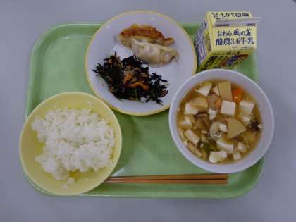 今日の献立は、エビと豆腐のうま煮、焼きぎょうざ、ひじきのごま和え、ご飯、牛乳 です。
