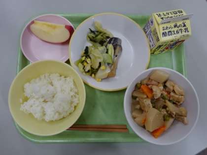 今日の献立は、さわらの西京焼き、チンゲンサイソテー、厚揚げの中華煮、りんご、ご飯、牛乳 です。