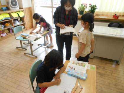 1年生は国語科で、文作りの学習をしました。「○○がどうする。」の文例に合わせて、思い思いに文作りを行いました。