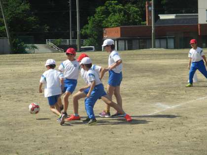 スポーツクラブは、グラウンドでサッカーをしました。汗をかきながらボールを追いかけていました。