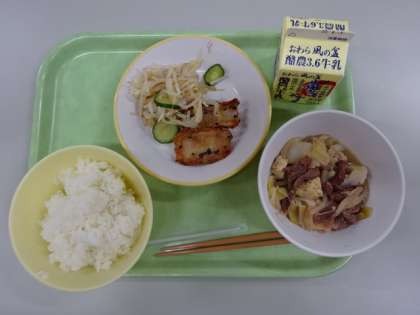 今日の献立は、ちくわの南部揚げ、甘酢和え、すき焼き、ご飯、牛乳 です。