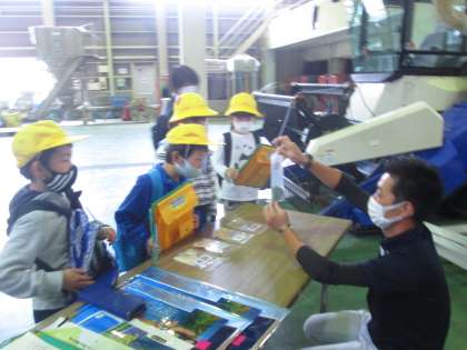 総合的な学習の時間で、山田地域を巡ってきました。最初は下中瀬のカントリーエレベーターを訪れました。苗の育て方から稲刈りをして、保存することまでを教えていただきました。また、中央制御室で米の管理をしていることも教わりました。
