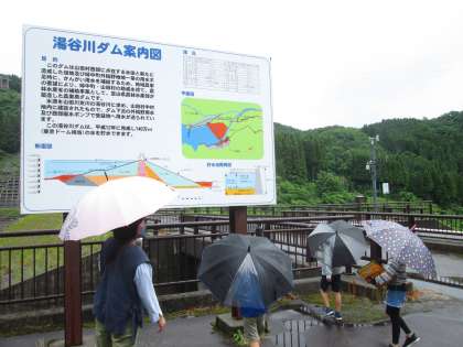 牛岳温泉スキー場を降りると、湯谷川ダムがあります。岩で作られていることから、ロック式ダムと呼ばれることを知りました。また、温泉が湧いていることから、お湯をくみにくる人も多いことを教えていただきました。
