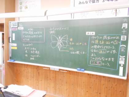 3年生は、昆虫のからだのつくりに見られる特徴をまとめました。昆虫の種類が違っても共通性があることに気付きました。