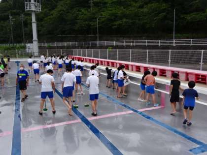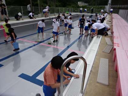 5限目は、3〜6年児童が、中学生と一緒にプール清掃をしました。プール内をたわしやスポンジを使って磨いたり、排水の溝にかぶせてあるカバーを丁寧に磨いて汚れを落としたりしました。プールサイドの黒ずみを、一生懸命こすってきれいにする姿もあり、プール学習を楽しみにしている様子が伝わってきました。