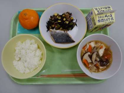 今日の献立は、さわらの西京焼き、ひじきのソテー、豆腐の野菜あんかけ、冷凍ミカン、ご飯、牛乳 です。