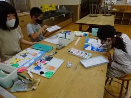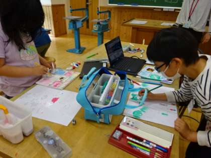 「未来の富山市」を思い描き、丁寧に着色していました。完成までもう一息です。