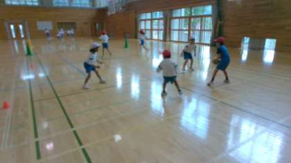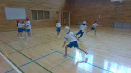体育では、『おたからゲットゲーム』をしています。『おたからゲットゲーム』とは、お宝をとりに行くゲッターと、おたからを取りにきたゲッターを捕まえるおにに分かれて行うゲームです。ゲッターは、おにに捕まらないように協力しておたからを取りに行きます。今日は、3チームに分かれておにの動きと、ゲッターのうごきを練習しました。3分間のゲームを3回行いました。色団での対決ができるように練習していきます。