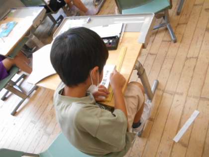 2年生は算数科で「教科書の縦と横の長さをはかりとる」学習活動に取り組みました。竹物差しを使って、それぞれが○cm□mmになることに気付きました。