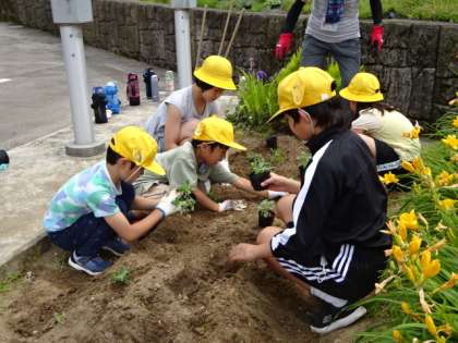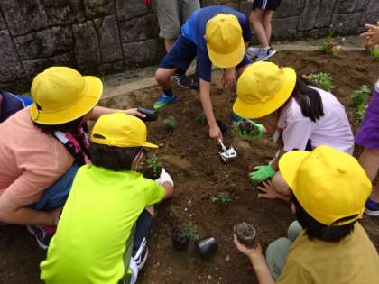 ペア学年での花苗植えの最終日は、2年生と5年生です。正面玄関前の花壇に、丁寧に苗を植えていました。これからきれいな花がたくさん咲くよう、お世話をがんばっていきます。