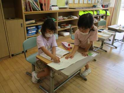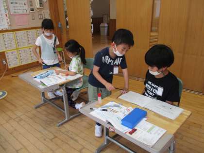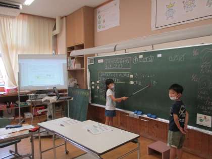 引き算の学習では、先生役の子供たちが前に出て、自分たちで授業を進めています。友達同士で、考え方や答えを確かめ合ったり、教え合ったりしている姿もすてきです。