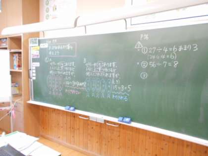 3年生は算数科で、あまりのあるわり算の学習に取り組みました。ある数を同じ数ずつ分けると、わりきれない場合に、いくつ分のあまりが出るかを図で表しながら考えました。